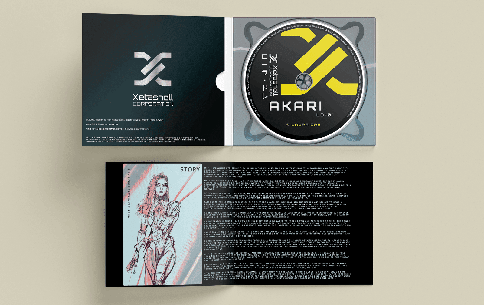 AKARI LD-01 is a cyberpunk concept album set on Hellcore IV, where the Xetashell Corporation mass-produces androids that begin to develop self-awareness and turn against their creator.